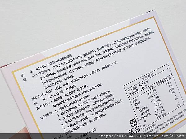 香氛姬軟膠囊成分添加多種複方成份,如:柿子萃取物、百合萃取、蔓越莓、洛神花、月見草油等…都是對於女性不錯的保健成分~